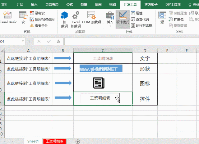 【开发工具】——【插入】——【命令按钮】,然后选择命令按钮,点击【属性】,将“题注”改为“薪资明细”: