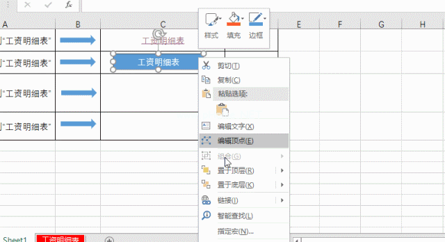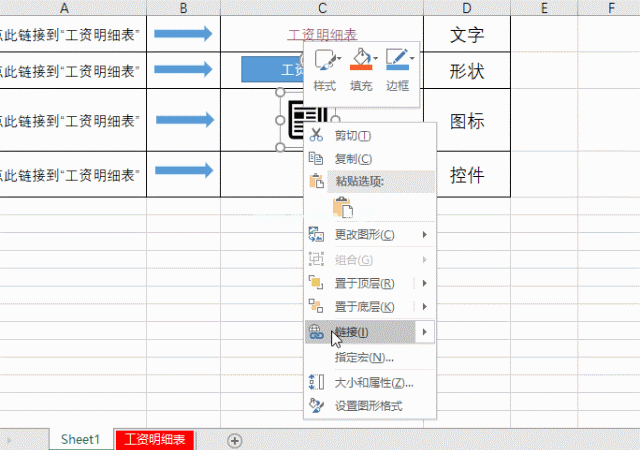 2.形状超链接和文本超链接的步骤相同:选中形状,右键,选择【链接】(——【插入超链接】)——【在本文档中的位置】——【薪资明细】: