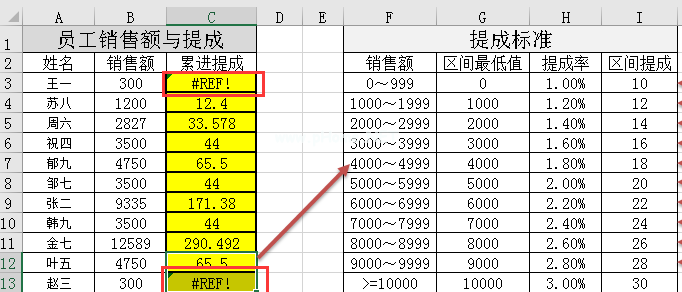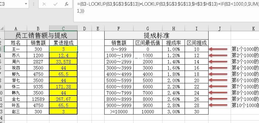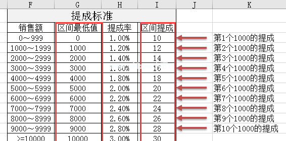 以B12中单元格4750对应的递进提升为例。单元格4750对应的销售范围是F7的4000 ~ 4999,所以对应的佣金应该是C12=(B12-G7) * H7总和(I:I6)。