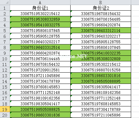 选择B2:B21并重复上述三个步骤,除了输入公式被更改为=或(精确(B2,$ a $2: $ a $21))=false。