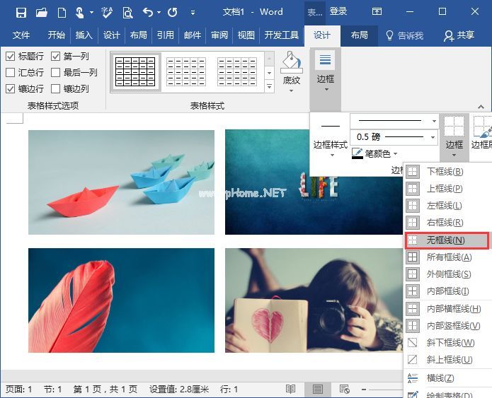 (5)再次选择整个表单,点击【表格工具】-【设计】-【边框】。选择[边框]-[无线框架]取消表格边框。