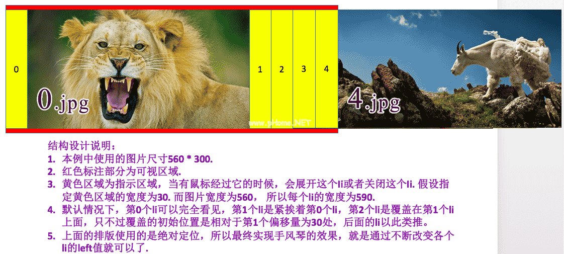 4.所有li都是绝对定位的,大小为590 * 300,然后设置下面li的左值,并将li的h3(黄色区域)属性设置为float。