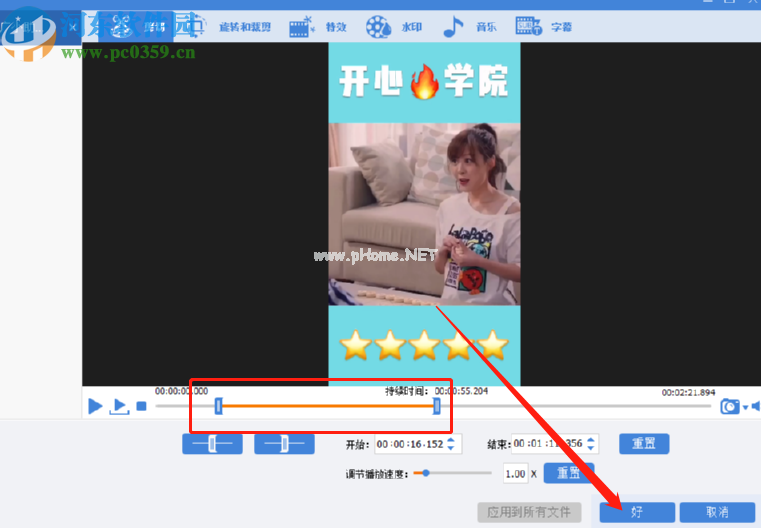 5.进入剪切视频文件的界面后,我们移动所选剪辑的两点,选择我们要剪切的位置,然后点击右下角的“确定”按钮。