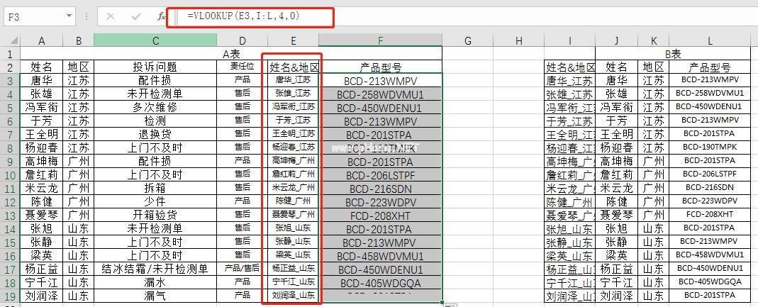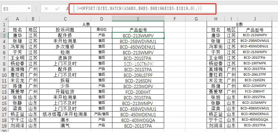 这里有一个例子可以和大家分享几种常用的多条件查询方法。下表是某电商公司的客户投诉表。现在,您需要按照表A中的客户名称和地区查询表B中的产品型号,然后返回到表A中的E列.