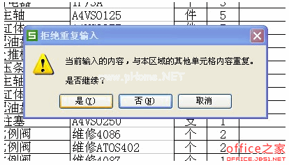 此时,您只能在选定的单元格区域中输入非重复的项目。当不小心输入重复项目时,会自动弹出“错误警告”进行提醒。