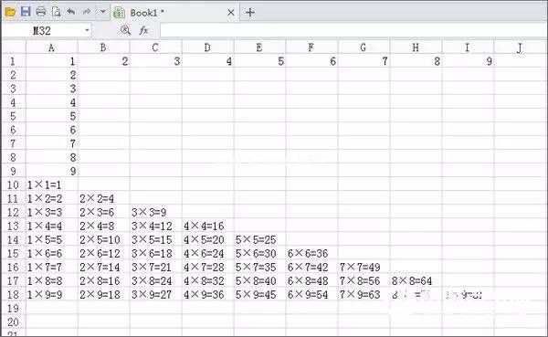 1.创建一个空白表单,在A1中输入1,将鼠标左键向右拖动到I1,向下拖动到A9,然后分别在A1到I1和A1到A9中输入1到9。