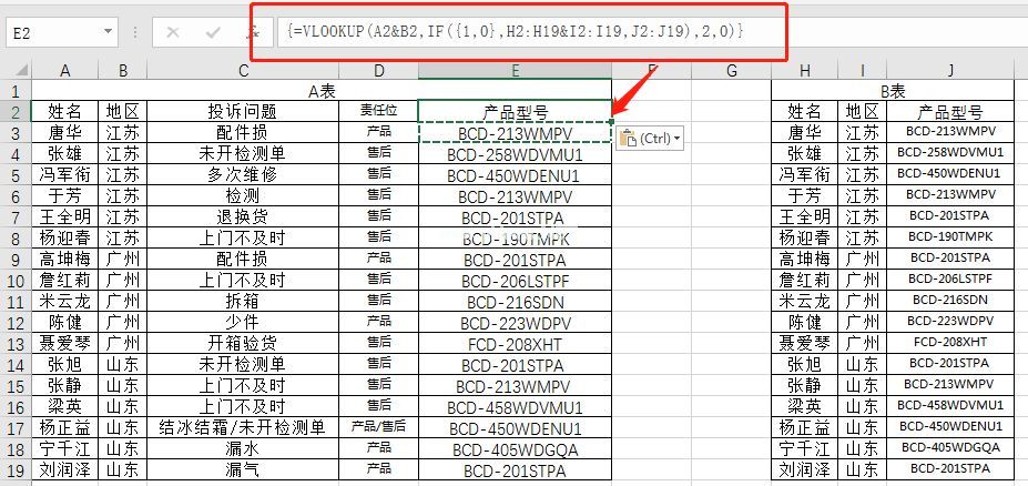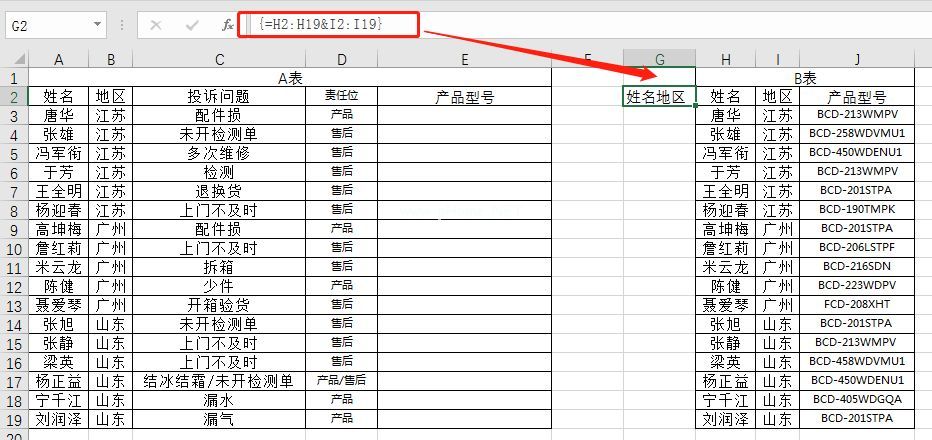 这里有一个例子可以和大家分享几种常用的多条件查询方法。下表是某电商公司的客户投诉表。现在,您需要按照表A中的客户名称和地区查询表B中的产品型号,然后返回到表A中的E列.