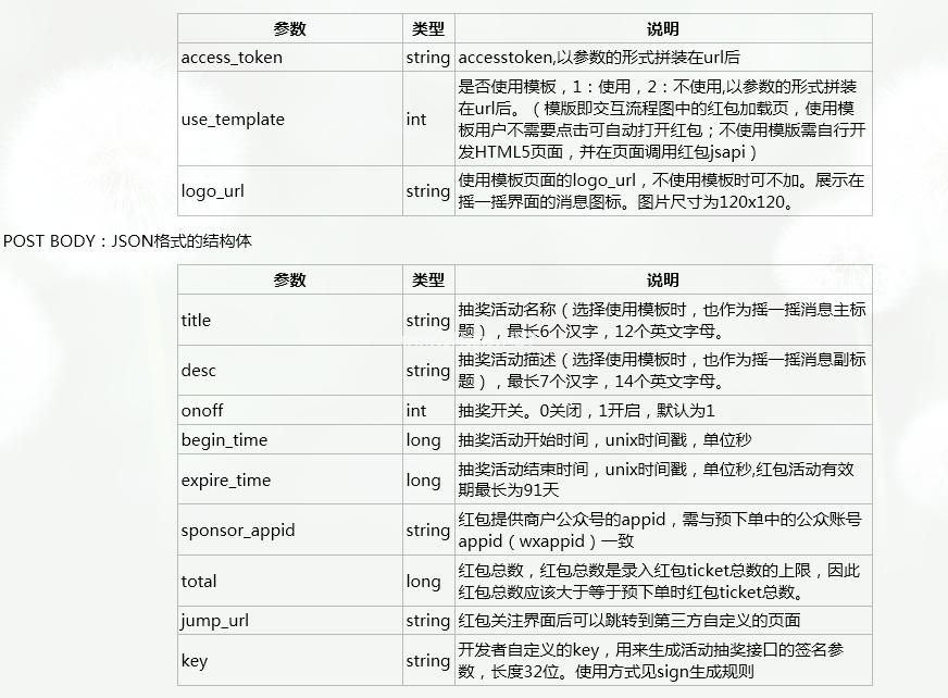 Http请求方法:姿势: https://api.weixin.qq.com/shakearound/lottery/addlotteryinfo?访问_令牌=访问令牌使用_模板=1登录_url=LOGO_URL