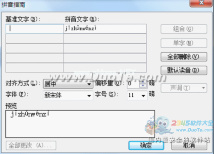 在拼音指南窗口中,点击组合,然后用鼠标选择参考文本,按空格键删除参考文本,然后用鼠标依次点击每个拼音,按空格键,用空格替换文本(如图04所示),在字体大小中选择合适的点值,必要时修改对齐方式。