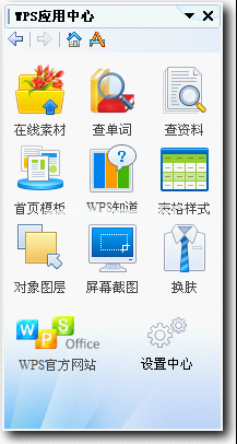 以前图形太简单,观看效果不好,需要更换,需要线上素材的便利。目前WPS校园版菜单项中的“应用中心”集成了9个主要应用。查看菜单项,点击“应用中心”按钮,界面右侧弹出一个面板。应用中心默认九大模块:在线素材、文本搜索、数据搜索、首页模板、WPS知识、表格样式、对象图层、截图、换肤。