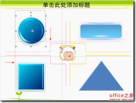 适当调整图形的位置和大小,通过调整图形的位置来调整图形的位置。首先,选择要调整的图形,使其边框上出现八个控制点,然后根据需要拖动控制点,图形的大小也会相应改变。当鼠标指针放在图形边缘除控制点以外的任何位置时,鼠标指针会伴随一个十字箭头,然后拖动鼠标调整图形的位置。左键选中第一个圆的图形,水平拖动,会出现一条垂直虚线,表示圆和正方形左对齐。沿着这条虚线上下移动,会出现一条水平虚线,表示圆形和矩形底部对齐。松开鼠标时,将设置圆的位置。