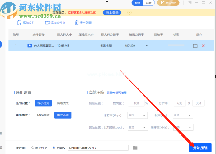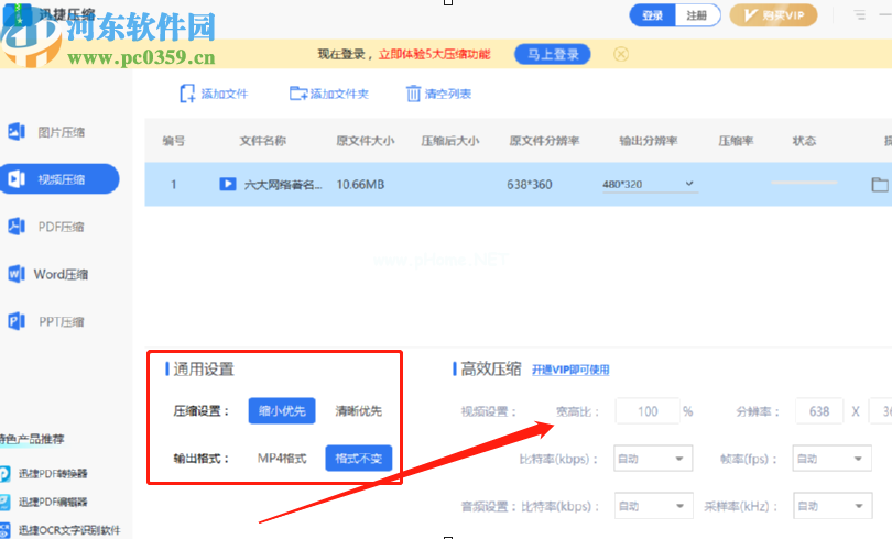 4.点击打开按钮成功将文件添加到界面后,我们可以设置压缩文件的参数。一般的设置可以根据我们自己的需要来选择,而高效压缩模块只有打开VIP后才能设置。