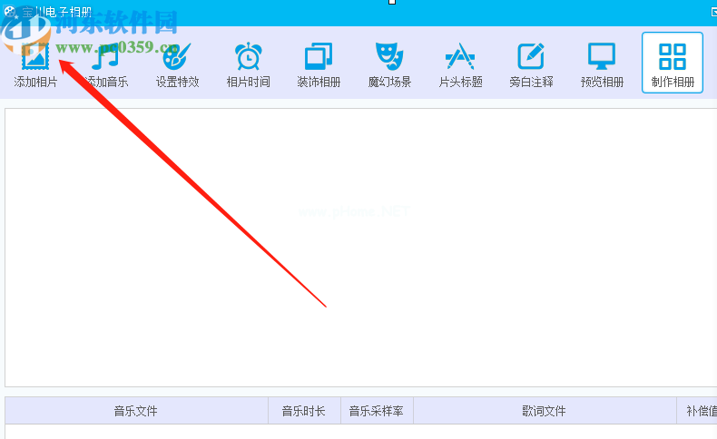 3.点击打开按钮后,我们可以在软件的主界面看到添加音乐功能按钮。点击后,我们可以给专辑添加背景音乐。