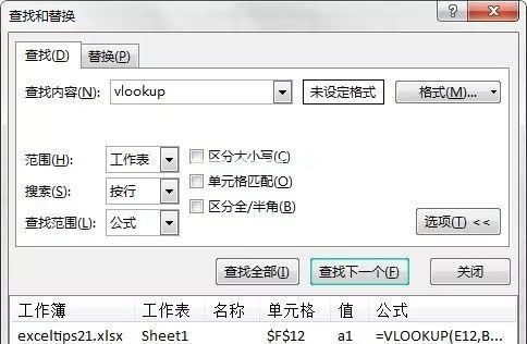 同样,在包含大量不同公式的工作表中,您也可以运行此技术来查找特定公式并定位公式所在的单元格。比如我想快速找到包含vlookup函数的公式,可以在“查找和替换”对话框的搜索内容中输入“VLOOKUP”进行搜索,然后定位对应公式的单元格,如下图5所示。