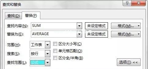 搜索内容输入“SUM”,替换为输入“AVERAGE”,搜索范围为“公式”。点击“全部替换”,工作表公式中的所有SUM函数将被AVERAGE函数替换,如下图4所示。