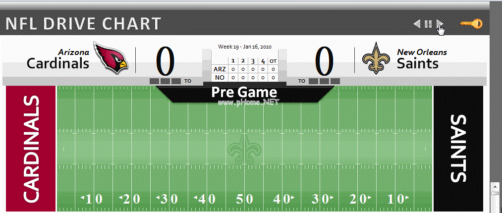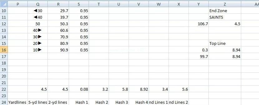 请注意,零代码线(结束区域和草皮之间的边界)实际上不是由一系列绘制的,而是由图表区域的背景组成的,并且是可见的,因为绘图区域中填充的背景被设置为主队徽标,这使得绘图区域的背景除了徽标所在的位置之外都是透明的。还要注意,零代码行是唯一完全从顶部延伸到底部的代码行。所有其他代码行从顶部和底部插入。这就是如何画一个真实的足球场。