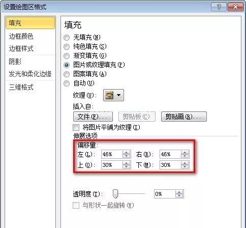 选择绘图区域,然后单击功能区上的“格式”选项卡。选择“形状填充——图片”,插入如图6所示的图片。此时,图片将填满整个绘图区域。打开“设置绘图区域格式”对话框,在“填充”选项卡中设置“拉伸选项”的“偏移”:左=46%,右=46%,上=30%,下=30%。如图7所示。