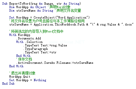 在本例中,有两个过程,其中主过程FinaDataAndExportToWord()调用ExportToWord()。ExportToWord过程用于向Word文档输出数据。