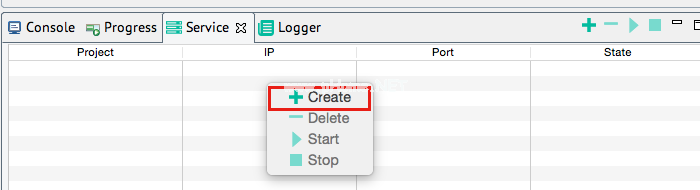 将上一步生成的安装包安装在移动设备(手机或pad)上后,基本界面如下,安卓、IOS、Winphone的基本界面相同。要调试,需要在设计器的“服务”中右键点击“创建”按钮,然后点击“启动”启动服务,记录显示的ip地址和端口号,然后在手机上调试版本的“服务地址”中输入ip地址。注意确保手机的ip和设计师所在的ip在同一个网段,否则无法通信。最后,点击“更新”按钮。