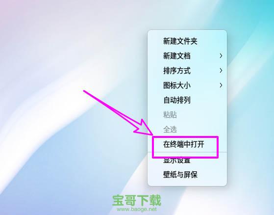 1、桌面空白处右键选择【在终端中打开】。