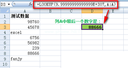 在公式中,Excel可以表示的最大数字是9.99999999999E307,LOOKUP函数查找这个数字,但是显示找不到,所以返回A列的最后一个数字。