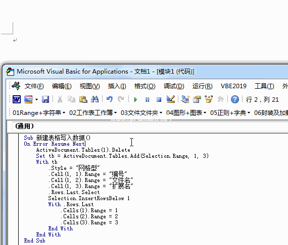 代码包括创建新表和编写数据。这里有一个简单的例子供参考。(这段代码直接在Word VBA中运行。如果需要在Excel中操作Word插入表,需要新建一个Word程序对象,属于之前的基础知识。)