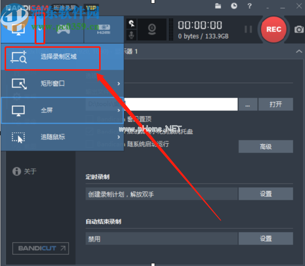 2.选择输出文件夹后,我们点击界面左上角的箭头,在出现的选项中点击选择录制区域的功能选项。