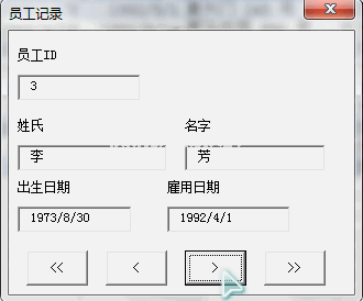 用户表单名称:ufEmployee用户表单标题:员工从上到下、从左到右记录在用户表单中。创建以下控件:员工ID文本框名称:tbxEEIDTag:Field0姓氏文本框名称:tbxLastNameTag:Field1名字文本框名称:tbxxfirst nametag:field 2出生日期文本框名称:tbxxblockdatetag:field 3就业日期文本框名称:tbxHireDateTag:field 4命令按钮名称:cmdfirstcaption:标记:buttonfirst命令按钮名称:cmdPrevCaption:标记:ButtonPrev命令按钮名称:cmdNextCaption:标记:ButtonNext命令按钮名称:cmdstcatoption