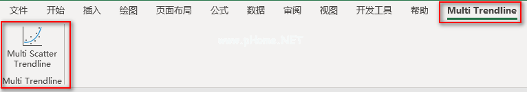安装插件后,Excel函数会添加一个名为“多趋势线”的选项卡,并带有一个名为“多分散趋势线”的命令按钮,如下图2所示。