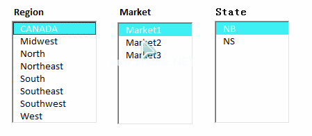 如上面的图1所示,一组创建的列表框-地区、市场和州可以一起工作。也就是说,如果选择了列表框“区域”中的某个项目,则列表框“市场”和“州”仅显示与所选区域项目相关联的值。同样,在列表框“市场”中选择一个项目,列表框“状态”中将仅显示与“市场”项目中的项目相关联的值。