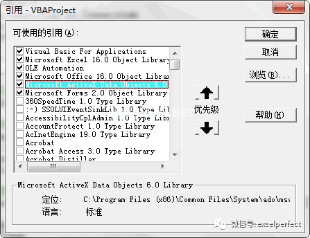 2.需要在VBE中设置对微软ActiveX数据对象库的引用,如下图2所示。