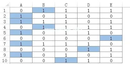给定一个任意大小的单元格区域,其每个单元格中的数据要么是0要么是1,并且每行至少有一个1,要求使用一个公式返回一个数组,该数组由区域每行中第一次出现一的相对列位置组成。例如下图一所示的单元格区域A1:E10,要求返回数组{2;1;1;2;1;5;1;4;1;3}。