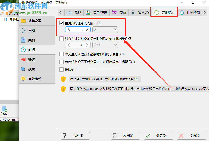 7.切换到任务的时间设置界面后,我们点击定期执行的功能模块,然后勾选“重复执行间隔”功能,然后设置同步任务定期执行的周期。设置后,单击确定。