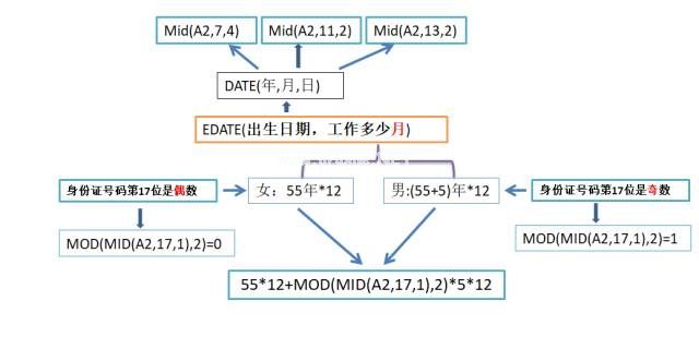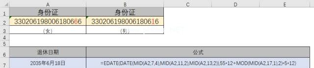 退休日期为女性55年或男性60年后的一年,以出生日期为起始时间。它们都使用EDATE函数。