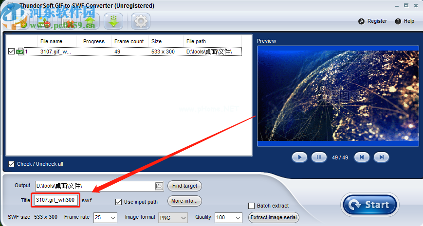 4.点击打开按钮后,选中的GIF动画被添加到软件界面,然后我们可以通过点击界面左下角的title模块来输入转换后的SWF文件的标题。