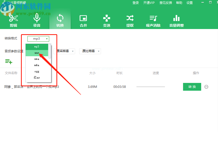 3.点击打开按钮后,音频文件成功添加到界面。然后,我们可以在转换格式的位置选择我们想要转换的格式。打开下拉列表后,我们可以选择AAC格式。
