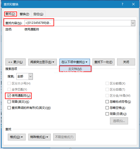 2.输入搜索内容为“[0123456789] @”在“搜索”中,打开“更多”,勾选“使用通配符”,在以下项目中搜索“选择”主文档,如下图所示。