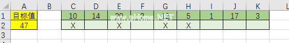 有时,我们给出一个目标值,并想知道哪个值是已经提供的一系列值的总和。如下图1所示,单元格A2中给出了目标值47,单元格C1:K1中有9个值。现在我们想知道这些值中的哪一个加起来是47,并在这些值下面的单元格中使用“x”标记。