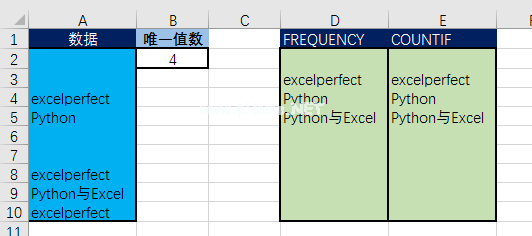 (作者个人倾向于使用第一个公式,比COUNTIF版本更灵活,速度更快,特别是当从中获取唯一值的数组是公式中其他函数生成的数组时。COUNTIF函数的缺点是传递给它的参数必须是实际的工作表区域引用。)