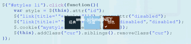 ul # style { margin-top :10 px } ul # style Li { float : left;宽度:50 px;高度:40 px;线高:40 px;padding:2px边距-left :10 px;border:1px实心# fff文本对齐:居中;color: # fffcursor : pointer } ul # style Li . cur { border :1 px solid # 369;背景-image : URL(images/selected . gif);背景-repeat : no-repeat;background-position :4 px 32px } ul # style Li #默认{ background-color : # 162934;} ul # style sli # blue { background-color : # 90c 5e 7 } ul # style sli # brown { background-color 3360 # 601 f 00 }使用CSS渲染XHTML,其中ul # styles li.cur指的是当前主题下选择的样式,我用一个小勾号表示当前选择的主题。JQeury首先,我们将介绍jquery库和jquery.cookie插件。jQuery.cookie插件为jQuery提供了强大的cookie操作功能。不需要编写复杂的原生javascript,直接调用插件即可。有关该插件的使用,请阅读本文: