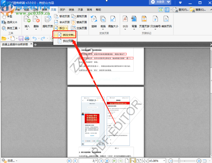 4.点击页面后,我们可以在出现的界面中看到拆分的功能。单击后,在出现的选项中单击拆分文档的选项。