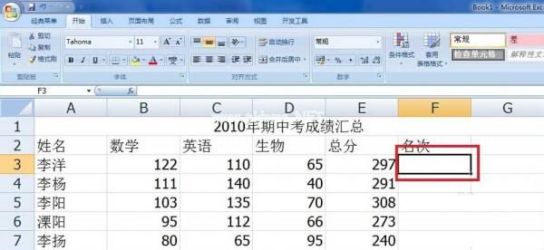 2.将光标设置在排名的下一个位置,即图中的F3。