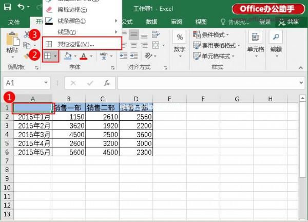 1.首先选择A1,点击“边框”按钮,从下拉菜单中选择“其他边框”。