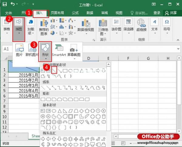 4.然后切换到“插入”选项卡的“插图”选项组,单击“形状”,并选择斜线。