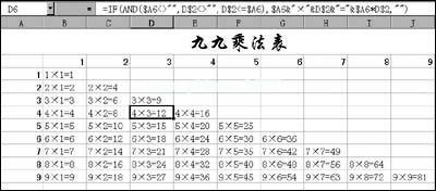 “下三角”形式是“99乘法表”的特点之一,是我们平时使用公式时通过拖动鼠标来实现的。如果此时用鼠标拖动,注意不要拖出下方的三角形。为了防止“出格”,比如“45=20”,我采用了“IF()”函数,即当A列单元格的值在1到9之间,第1行单元格的值在1到9之间时,不大于A列单元格的对应值(比如$A6 "、" $ D $ 2 "、" $ D $)。因此,公式可以改为:"=if (and ($ a6),d $2 ",d $2=$ a6" "d $2"="$ a6 * d $2 ")"。现在用鼠标拖动,看看它是否能产生如图3所示的效果。