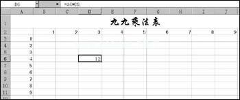 “九九乘法表”中的数值结果都是行值乘以列值得到的,所以Excel单元格中的数值也要乘以列值。例如,D6的值是A6乘以D2的结果,其公式为:“=A6*D2”。