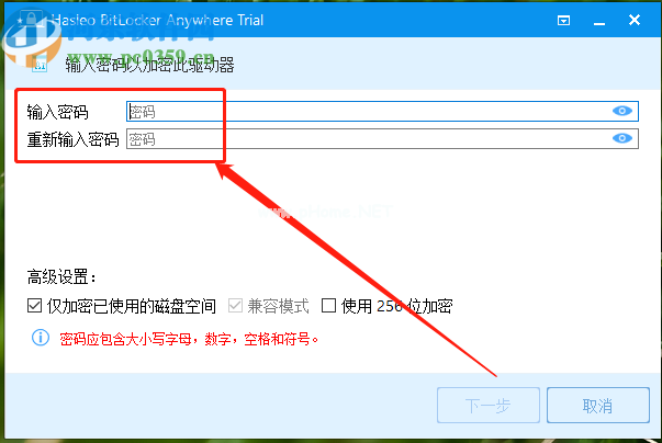 2.点击此按钮打开BitLocker选项,然后进入加密磁盘密码设置界面。我们需要在界面中输入加密磁盘的密码。