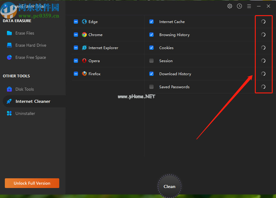 3.软件扫描完成后,我们可以在界面中看到每个浏览器中扫描了多少缓存文件,包括Cookie、下载历史记录等类型的缓存文件,然后点击下方的Clean开始清理。
