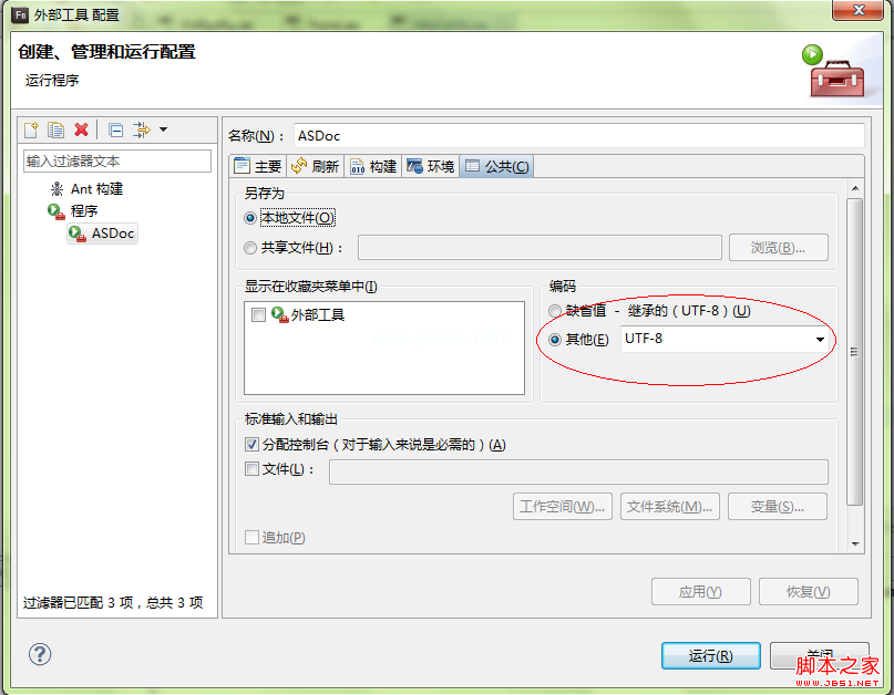 名字:随意,这里我拿的是ASDoc。位置:选择asDoc.exe在安装目录中的路径。我的工作目录是d : \ Adobe Flash Builder 4.6 \ Adobe Flash Builder 4.6 \ SDKS \ 4 . 6 . 0 \ bin \ as doc . exe:直接默认为${project_loc}。这样,系统会将您当前打开的as class或mxml文件所在的项目作为默认的输出项目自变量:关于这个参数有很多在线数据。这里就不细说了——来源——路径:代码所在目录(不允许中文目录)——文档——来源:文件所在目录(不允许中文目录)——输出:文档输出的目录(不允许中文目录)——外部——库——路径:扩展lib路径(外部swc的路径)(不允许中文目录)——主——标题文档首页显示的标题,这里我添加为‘SuperMap I Client 6R(2012)for Flex Real Space Help Document’。这里我写了以下三个标题,前两个必须写。-source-path src-doc-sources src-main-title ' SuperMap I Client 6R(2012)for Flex Real Space帮助文档' 2。该文档支持中文注释。为了使生成的文档支持中文标注,我们需要切换到“公共”,编码-其他-选择UTF-8。如下: