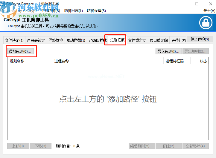 2.启动保护功能后,我们点击进程拦截功能的页面,然后点击添加规则按钮,然后我们可以选择我们想要拦截的进程规则。
